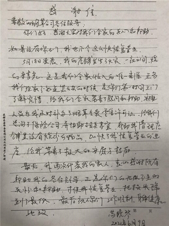 四川新闻网消息(刘景 杨桥 记者 李田)6月9日,眉山仁寿县烟草专卖局收到一封来自受灾卷烟零售客户苟晓琴的感谢信,对仁寿烟草帮扶她重建受灾超市、恢复正常营业的爱心之举表示衷心感谢。
