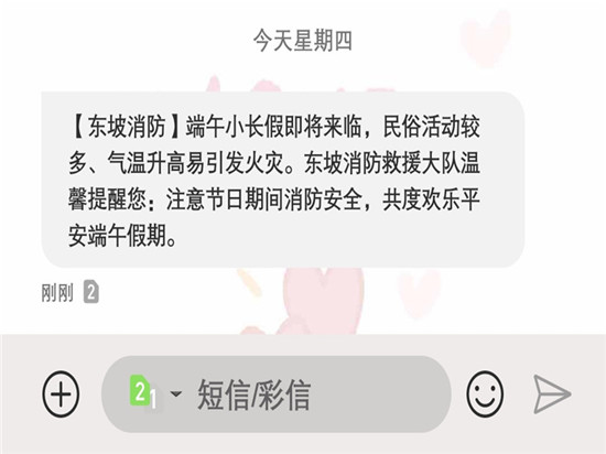 四川新闻网消息 为进一步做好端午期间消防宣传工作,扩大消防宣传覆盖面,切实提高群众消防安全意识及自防自救能力。6月10日,东坡区消防救援大队利用短信平台发放端午节消防安全提示短信助力节日期间消防安全。