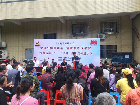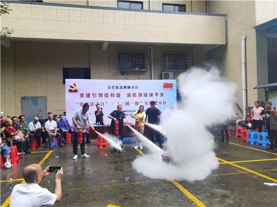 演练开始前,麒麟社区党支部书记代表社区讲话,他希望能够通过此次活动,加强居民应对消防安全问题的能力,全方面提高社区开展消防演习。活动开始后,工作人员及居民在听到警鸣声后开始意识到发生火灾,随后,他们在消防人员和党员志愿者的引导下,手捂湿毛巾,井然有序的、迅速地撤离到安全的避难场所。演练后,消防人员耐心为居民讲解火灾的预防、逃生自救技能和灭火器等消防器材使用的消防知识,指出居民在演练过程中应该注意的事项和错误之处,使居民更进步了解消防知识。最后,在消防人员的指导下,辖区居民轮流使用灭火器,了解其正确的使用步骤及方法。