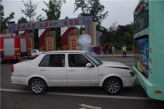 上午9点,演练正式开始。模拟现场,一辆公交车正在行驶车上坐满了乘客。公交车驾驶员驾驶公交车(川Z*****)朝着公交站台驶入,在公交车的后方,小车驾驶员驾驶一辆私家小车(参演小车川Z*****)。紧跟其后,当公交车即将进站时,后方小车因车速过快,撞上了公交车尾部。事故发生后,公交车驾驶员立即开启警示灯,拉起断气刹,快速下车放置安全警示牌,同时拿出手机拨打报警电话并报告公司平台,并拨打119、110报警,拨打120救助。