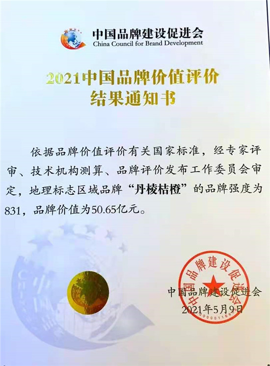 四川新闻网消息(王琴 记者 李田)日前,中国品牌建设促进会发布2021中国品牌价值评价结果的通知书,依据品牌价值评价有关国家标准,经专家评审、技术机构测算、品牌评价发布工作委员会审定,地理标志区域品牌“丹棱桔橙”的品牌强度为831,品牌价值为50.65亿元,比去年增加2.4亿元。