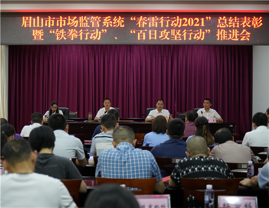 眉山天府新区市场监管和综合执法局、各区县市场监管局、园区分局主要负责人,执法稽查和“百日攻坚行动”分管领导,市局相关科室负责同志参加会议。(眉山市市场监管局供图/供稿)