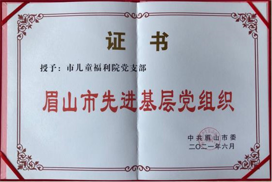 四川新闻网消息 2021年6月28日,在眉山市“两优一先”评选表彰大会上,中共眉山市委表彰了一批优秀共产党员、优秀党务工作者、先进基层党组织。全市共表彰50个先进基层党组织,其中市直机关工委4个,眉山市儿童福利院党支部占据一席,荣获“眉山市先进基层党组织”称号。
