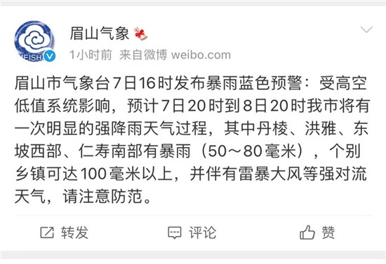 可就在一片叫热中,眉山气象台发布了暴雨蓝色预警:受高空低值系统影响,预计7日20时到8日20时眉山将有一次明显的强降雨天气过程,其中丹棱、洪雅、东坡西部、仁寿南部有暴雨(50~80毫米),个别乡镇可达100毫米以上,并伴有雷暴大风等强对流天气,请注意防范。