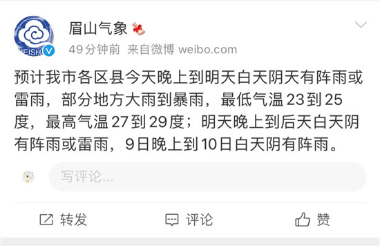 从天气预报来看,未来三天眉山都将以降雨为主,今天晚上到明天白天阴天有阵雨或雷雨,部分地方大雨到暴雨,最低气温23到25度,最高气温27到29度;明天晚上到后天白天阴有阵雨或雷雨,9日晚上到10日白天阴有阵雨。
