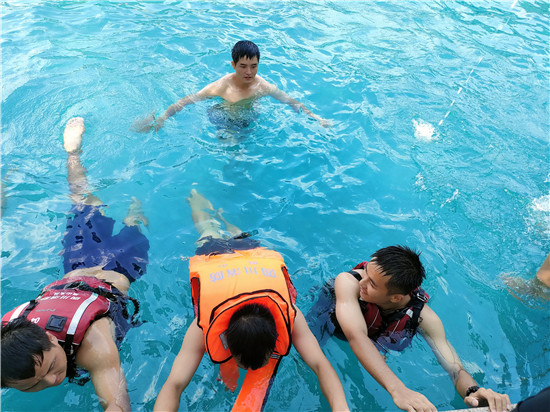 训练前,值班班长向参训队员明确培训纪律,要求全体人员严格落实好“三个禁止”,即禁止未经热身活动下水、禁止伤病号下水、禁止在游泳池中嬉戏打闹。训练过程中,值班班长耐心讲解动作要领,示范游泳动作,全体参训人员充分发扬不怕苦,不怕累的精神,认真听讲学习,反复钻研。参训人员分为初学组和提高组,受过专业训练的队员对不会的队员进行现场教学,主要对基础泳姿、快速救援、特殊情况的处置应对等专业化知识进行现场讲解与操作演示。