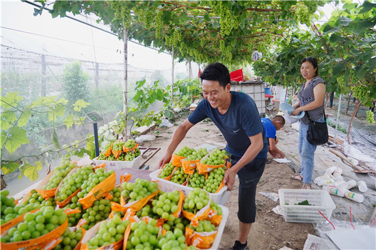 果园村葡萄丰收在即,这几天,该村好运来家庭农场联盟党支部书记张雄正忙着统计各家庭农场的葡萄产量,方便向不同需求量的客商推荐。