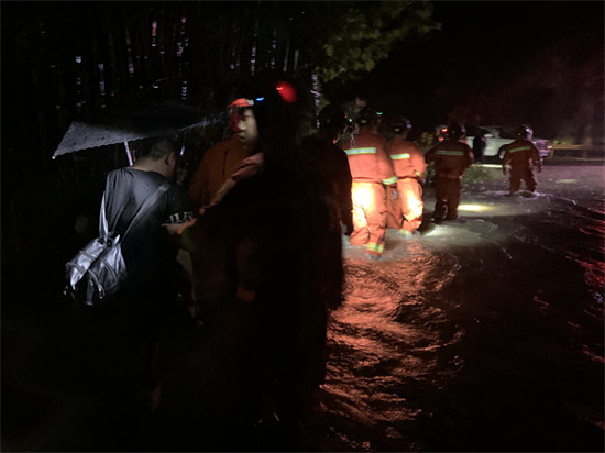 21时40分救援力量到达现场,经勘查发现,因雨水倒灌,使原本的道路变成了水流湍急的河流,部分地势低洼的水位已达救援人员的大腿位置,暴雨持续,水位还在不断上涨。消防救援人员在强光灯的照射下,通过探棍探路和喊话等方式,逐步找到5名被困人员,其中一名妇女因水位的持续上涨表现异常惊慌,嘴里反复念着“我不会游泳”,“快来救我”。消防指战员立即赶赴妇女身边,安慰她“没事的,现在水位还不是太深,就像是河边边踩水一样,凉快呢。”“来我牵着你,跟着我走,我会保护你的。”在消防指战员坚定的话语下,妇女渐渐平缓了心神。