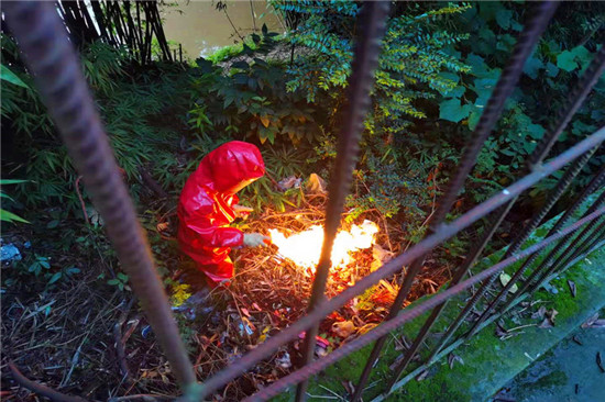 到达现场后,在报警人的带领下来到马蜂窝地点。经现场勘查后指挥员决定采取“火攻”,随即让一名具有“火攻”马蜂窝处置经验的队员穿上防蜂服,拿上灭蚊器对马蜂窝进行灭杀。随后用准备好的编织袋将整个蜂窝从根部拧掉,装入袋中。为了防止马蜂再次在此筑巢,该队员又对蜂窝根部进行了清理,将掉落在地上的蜂窝随便扫进垃圾袋中带走。
