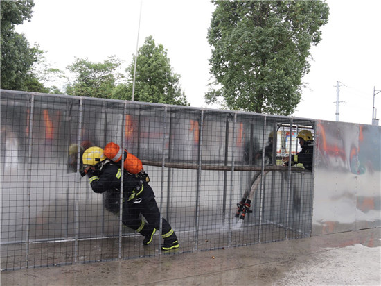 训练场上,随着响亮的“开始”命令发出,四名队员在水枪掩护下成功破拆防盗门,并携带水枪、水带跨越挡板,穿过1号通道,将受困者抬上担架原路返回。随后,参训队员肩扛水带,手握水枪穿过2号通道,在出口处将“大火”扑灭。