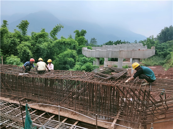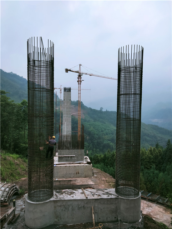 在王关大桥施工点,工人们正在进行盖梁钢筋捆扎、焊接和混凝土施工。而麻柳坪特大桥5号、6号主墩已封顶,工人正在进行上部结构盖梁施工,其他桥墩的施工也正按计划有条不紊推进。