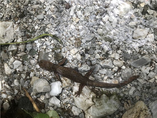 山溪鲵为小鲵科属两栖爬行动物,俗名羌活鱼、白龙、杉木鱼,又被称为“中国小鲵”,与恐龙同处一个发展时代,与国宝大熊猫一同被列入《中国濒危动物红皮书》,堪称“生物活化石”,是中国的特有物种。分布于四川、贵州、云南等地,常见于高山山溪及湖泊石块树根下以及苔藓中或融雪泉水碎石下。从形态上看,山溪鲵似蜥非蜥,似鱼非鱼,体长一般为10厘米至30厘米,体重为50克至250克,主要靠肺和湿润的皮肤交换空气呼吸,一般靠近水源生活,以苔藓或节肢动物幼虫为食。