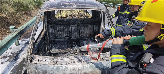 12时40分,现场处置完毕,指战员们在对货车各个角落进行细致检查,确保无复燃危险后归队。(洪雅消防救援大队供图)
