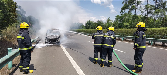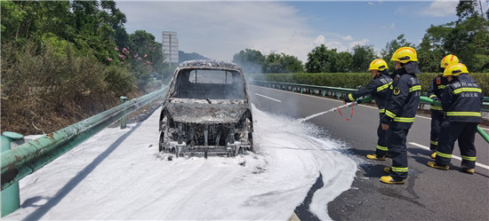 12时32分,消防指战员到达现场,发现火势正处于猛烈燃烧阶段,整辆车已经被大火吞灭,车辆内部情况不明。