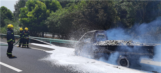 经过火情侦察,现场指挥员迅速下达作战命令,警戒组立即对现场进行断道警戒,防止货车在燃烧过程中对来往车辆造成伤害;灭火组出泡沫枪对着火车辆进行控制、扑救。与此同时,高速路政也赶到现场,对现场进行交通管制。