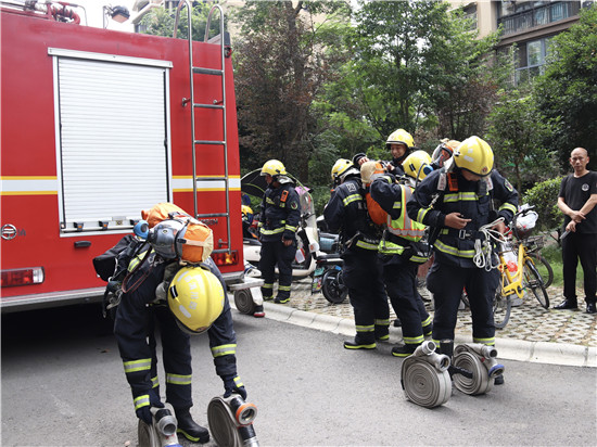 在测试演练过程中,大队指战员对小区的建筑结构、消防设施、安全出口、疏散通道等基本情况进行了熟悉,并随机假定灾情,设置最不利点,利用水罐消防车供水开展沿外墙垂直铺设水带灭火和沿楼梯间铺设水带灭火随机演练活动,达到了测试练兵的目的。