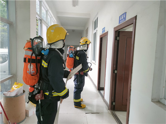 此次模拟下午15时30分,彩虹制药厂质检楼QC办公室起火,接到报警后,青神县消防救援大队调派一车6人前往处置,15时50分,现场火势得到有效控制,“明火”被全部扑灭,无人员伤亡。