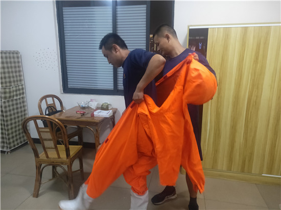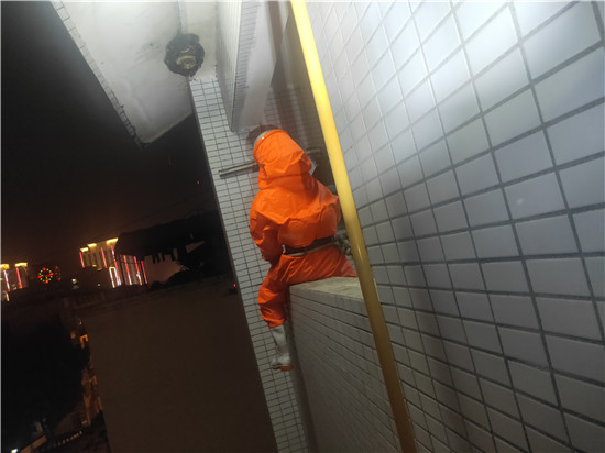 针对现场情况,队员们立即通知周围居民关闭门窗,避免在取蜂窝时遭到受惊马蜂的攻击。同时,队员穿好防护服,系好安全绳防止坠落,并采用火攻成功摘取马蜂窝,随后利用编织袋对整个马蜂窝进行套装。在蜂窝被铲除后,并用杀虫剂彻底清扫蜂窝周围的残余蜂窝,以防马蜂继续做窝。