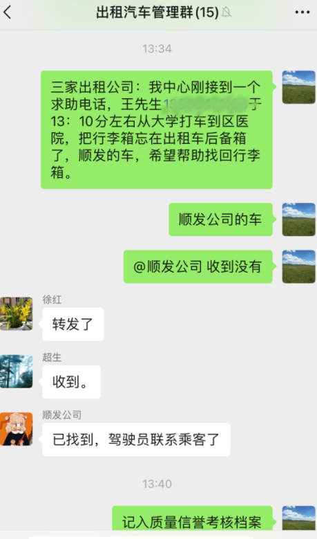 接到群众的求助后,考虑到失主丢失行李的焦急心情,本着对群众负责的态度,值班人员一边安慰失主情绪、一边立即将求助信息转发给出租车工作群迅速查找。经过努力,找到出租车司机张师傅,经张师傅检查,的确发现后备箱有一个行李箱,立即与失主取得了联系。