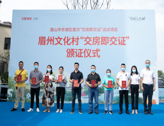 四川新闻网消息(胡娜 记者 李田)8月30日,眉山市东坡区“交房即交证”颁证仪式在崇礼新城万科眉州文化村揽江一期举行,270户业主代表将一手拿钥匙,一手拿产权,成为眉山市东坡区首批享受“交房即交证”新举措的业主。