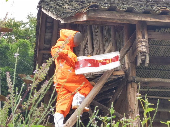 随后,两名消防指战员身穿专用防蜂服,携带杀虫剂和编织袋等工具,沿着爬梯缓慢地靠近马蜂窝。一接近蜂窝,马蜂立即对全副武装的消防指战员进行攻击,撞在防蜂服上不时发出“啪啪”声响。消防指战员在使用杀虫剂对马蜂进行喷射,将马蜂窝外围的“哨兵”马峰杀灭后,极大限制了马蜂的行动,等在外围的马峰被杀死后,消防指战员再用事先准备好的编织袋,迅速将马蜂窝整个取下,装进了编织袋内。