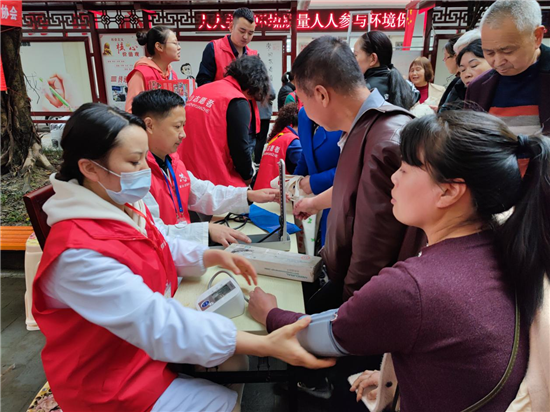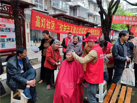 在高灯社区文化院坝,一系列文明实践服务活动有序展开。志愿者们有序地引导着市民们排队填写《庆祝建党百年 弘扬雷锋精神》知识问卷,向他们发放生态环保、垃圾分类、文明养犬、创文创卫等各类知识宣传单,市民们则争先恐后地向志愿者们提问,不断提升自身文明素养,学习党史理论。另一边,医生们免费为居民提供血压、心率测量义诊服务,耐心回答群众的医疗咨询。理发协会的志愿者则现场为居民免费理发,为居民们减去烦恼,幸福生活从“头”开始,现场温情满满,充满欢声笑语……这只是眉山新时代文明实践活动的一个缩影。