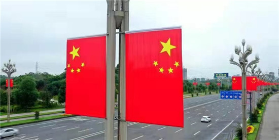 今(29)日,本网在眉州大道、东坡大道、滨江路、红星路等重要路段看到园林工人们正在悬挂国旗。一抹抹“中国红”在蓝天白云绿树的映衬下显得格外庄重热烈,传递着人们无限的爱国情。