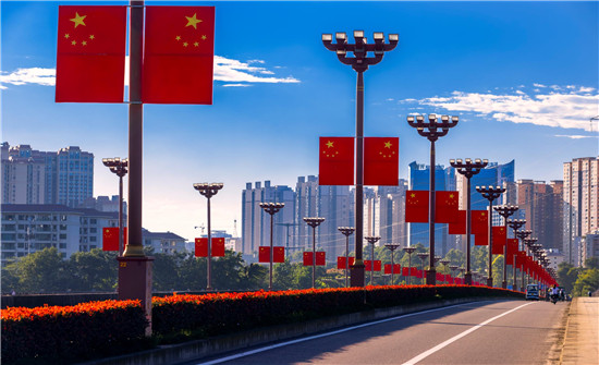 9月29日,岷江二桥挂满国旗,中国红映红岷江二桥,成为一道释放爱国情怀的风景,十分壮美。