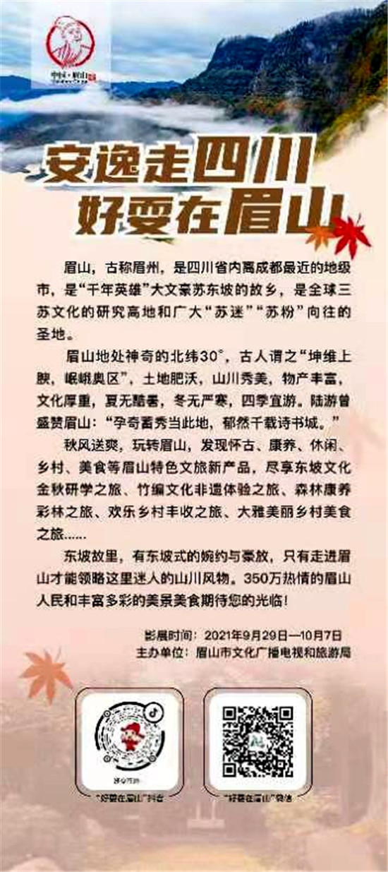 眉山是大文豪苏东坡的故乡,是四川省内离成都最近的地级市,有着悠久厚重的历史文化,丰富多彩的美景美食,便捷通达的交通条件。国庆大假即将来临,眉山文旅在成都宽窄巷子向广大游客盛情发出邀请,欢迎大家走进东坡故里,玩转新眉山,找回快乐的自己。(眉山市文广旅局供稿/供图)
