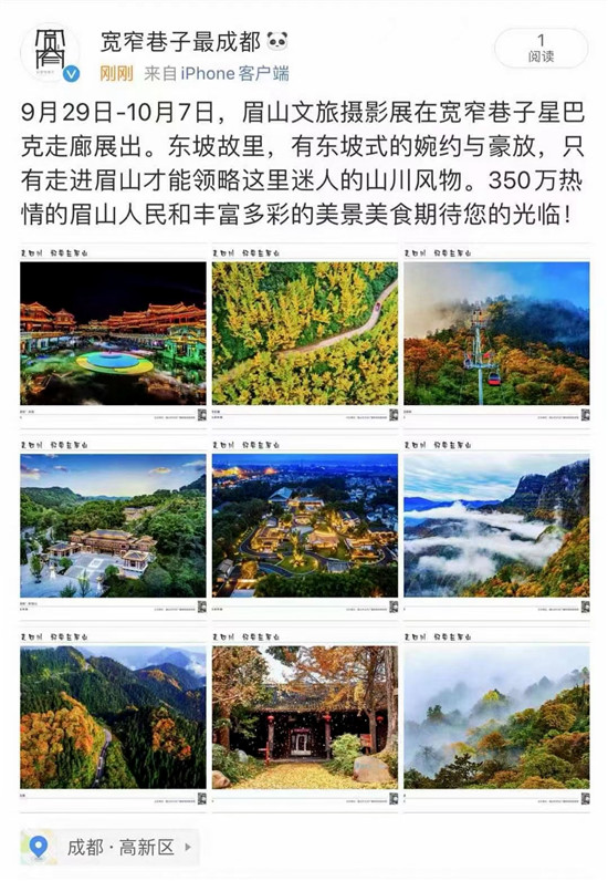 四川新闻网消息 今年9月29日—10月7日,以“安逸走四川 好耍在眉山”为主题的眉山文旅摄影展在成都宽窄巷子星巴克走廊开展。