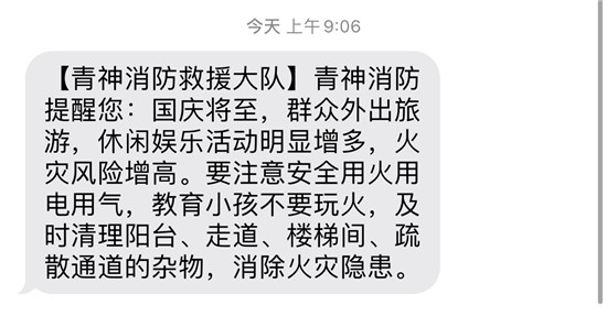 “国庆将至,群众外出旅游,休闲娱乐活动明显增多,火灾风险增高。要注意安全用火用电用气,教育小孩不要玩火……”大队借助短信平台覆盖面广,受众多,传播速度快等特点,以此来提醒广大人民群众共同关注消防、支持消防、增强人民群众消防安全意识。
