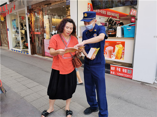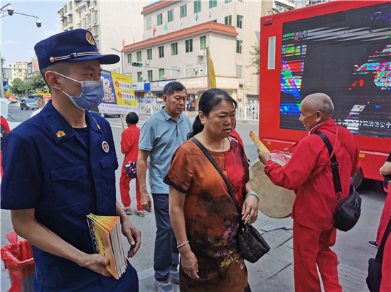 三是培训宣传,全面覆盖。大队积极开展国庆节消防安全培训演练和宣传工作,利用辖区LED显示屏循环滚动播放消防安全宣传标语、视频等,扩大消防宣传教育覆盖面和影响力,时刻提醒往来群众关注消防、学习消防。同时,大队派出宣传人员,深入社区、街道、商场、饭店等场所进行消防宣传彩页发放,细心向群众讲解报警、扑救、逃生与自救的方法,普及防火和自防自救知识以及秋季容易引起火灾的环节,为国庆期间民众自觉提升消防安全意识奠定基础。