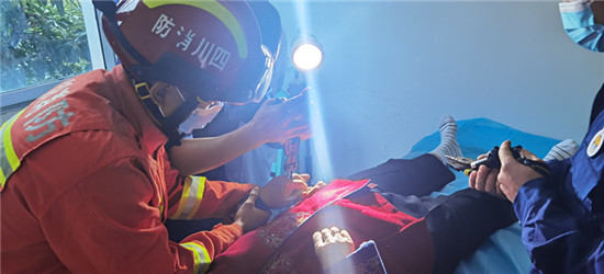 而这时老人的手指情况已经十分严重,戒指已经完全嵌入肉里,贸然取下戒指无法及时进行救治,消防指战员立即带着老人前往医院。在多人配合破拆的过程中,消防指战员为避免给老人造成二次伤害,叫来医生全程在旁观察、消毒和清理血渍。25分钟后,消防指战员协同医务人员成功将戒指取出。(洪雅县消防救援大队供图)