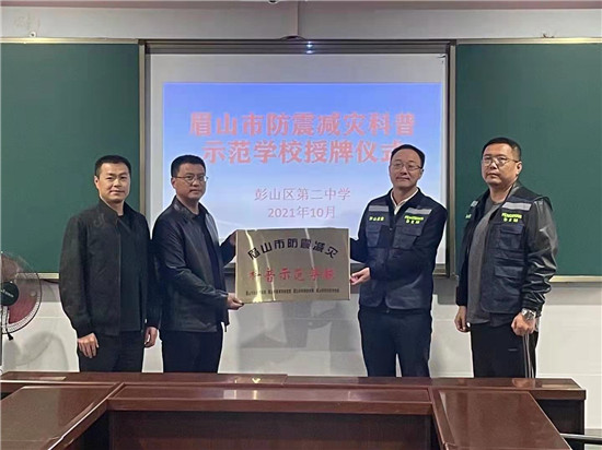 四川新闻网消息(谢欣 记者 李田)10月19日上午,眉山市彭山区应急管理局、教体局负责分管安全的领导一行,为获得“市级防震减灾科普示范学校”的彭山区第二中学、彭山区第三中学和彭山区谢家街道中学授牌。