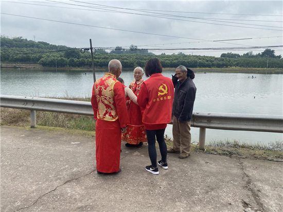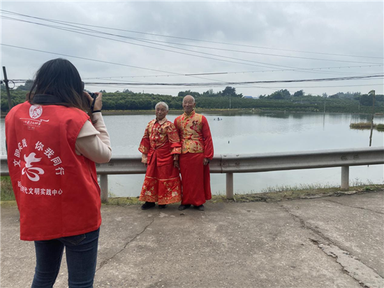李星举、万素芳夫妻双双在党50周年,现在年逾古稀,行动不便,但始终坚持参加党组织的每一次活动,坚持服务为民,感恩于党。金岗村党组织问及他们的愿望时,他们说自己结婚50年了,从来没有拍过一张合照,为此,金岗村两委联合彭山区新时代文明实践站为其圆梦,在这个特殊的年份给予一份“金婚”祝福。当志愿者为二老穿上大红鲜艳的“婚服”时,她们无比激动,老伴李叔叔更是高兴得合不拢嘴,连连说“当初我干村支书时只有29元一个月,完全是在为人民服务,现在老了,党和政府还这么关心我们,我永远爱党,一定要不遗余力地继续发挥余热!”(彭山区公义镇供图)