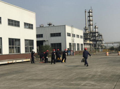 本次应急演练模拟四川绿艺华福石化科技有限公司在使用叉车对桶装废矿物油进行转移时,因夹桶器未夹稳,废矿物油桶突然掉落倾倒,大量废矿物油泄漏并向四周流淌,部分已流进就近雨水沟,装卸班班长立即通知污水处理站关闭雨污分流井内的雨水排放阀,并打开污水排放阀进入应急池收集。随后与其他人员立即取用消防沙对流淌油进行围堵,同时用消防沙袋对雨水井口进行遮挡。围堵成功后收集泄漏物过程中,一员工用消防铲铲沙时因力度过大,撞击地面产生火星与泄漏废油挥发形成的可燃气体接触,发生瞬间燃爆后废液继续燃烧。参演单位立即成立了应急处置、应急监测、医疗救护等五个小组,穿戴消防服,佩戴空呼,携带若干灭火器等器材,开展灭火和救援,并立即向相关部门报告。彭山生态环境局接到报告后,立即启动突发环境事件应急预案,组织相关人员立即赶赴事故现场,了解现场污染状况及可能影响范围并立即进行布点监测。并组织人员对部分已流进雨水沟的做进一步封堵;同时,环境应急监测人员开始对事故现场的水环境质量进行监测……