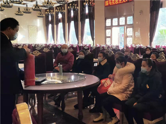 培训中,大队宣传人员首先组织全体参训人员观看了火灾警示教育片,随后列举了近期发生的火灾案例,深入浅出地讲述了消防安全的重要性,并详细介绍了宾馆酒店消防安全预防、灭火器的使用、火场逃生自救、互救及正确的报警方式等方面的知识。如:在发生火灾时,对人身安全威胁最大的是现场的浓烟,在浓烟中,湿毛巾捂住口鼻是最常见的救助方法;毛巾沾水折三折,捂住口鼻,蹲下身子,手背贴墙沿墙边逃生。