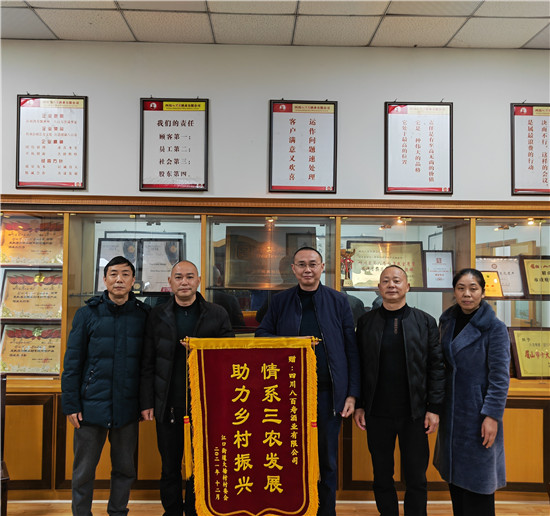 四川新闻网消息(陈小菊 记者 李田)12月6日,彭山区江口街道大塘村党委书记、村委会主任陈国清一行将一面“情系三农发展,助力乡村振兴”的锦旗送到四川八百寿酒业有限公司总经理彭仲辉手中,并激动地说:“感谢你们公司对我们村的关心支持”。