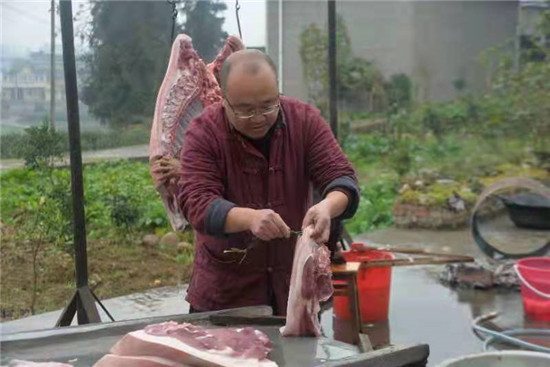 元旦节当天,洪雅县柳江镇的董耀军家里一大早就热闹起来了,亲友邻居们前来帮忙烧开水、赶猪、杀猪,不到两个小时的时间,三百多斤的猪肉就被分割成小块,大家在忙碌中享受这份传统的快乐。