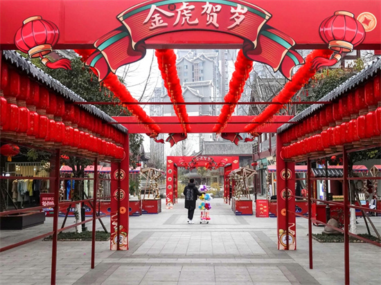 网红打卡地东坡印象水街,近日水街的人虽然不多,但年味已渐渐变浓,街道、房屋、树梢等都挂起了红灯笼,一派喜迎新春佳节的气氛。 (眉山市文广旅局供图)