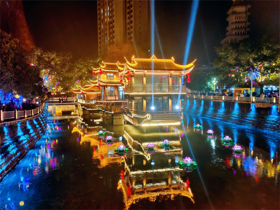 “今年洪雅的灯光非常漂亮,和家人出来体验一下热热闹闹的过年氛围。这么美的夜景,拍个照发个朋友圈,也可以宣传一下我们的洪雅。”颇具年味的迎新春灯光也吸引了市民王宛晴的兴趣。每至夜幕降临,华灯初上时,这座山水小城处处“火树银花”,人们纷纷走出家门,或携家人或带朋友,在璀璨的夜景下用相机定格美丽瞬间。