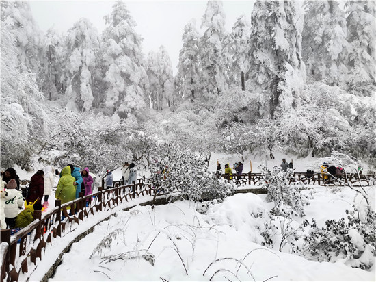 春节期间,该县瓦屋山景区再次成为冰雪旅游的热门打卡地,洁白的雪淞、雾凇“盛开”在山顶的冷杉树上,整座山峦银装素裹,好似“千树万树梨花开”。游客们则尽情地在雪地玩耍,尽享南方冰雪的魅力。