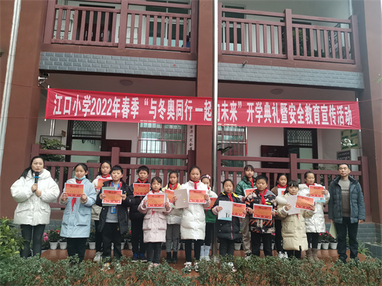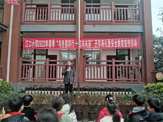 四川新闻网消息 2月17日上午,彭山区江口小学举行了“与冬奥同行 一起向未来”开学典礼暨江口街道安全教育进校园宣传活动。