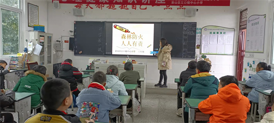 接着江口街道给全体师生上新学期安全教育第一课。街道副办主任郭远玉同志对小学生学习怎样森林防火知识进行剖析讲解。
