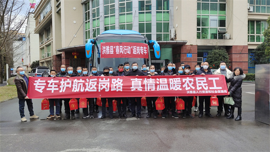 四川新闻网消息 2月19日,在眉山市洪雅县人社局院坝里, 27名农民工坐上了由洪雅直达江西景德镇的返岗专车。
