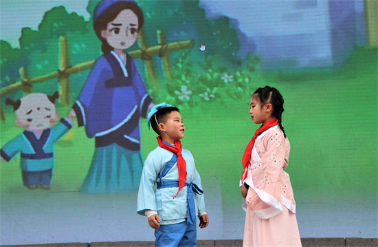 儿童剧《孟母三迁》在孩子们的展示中,把每一个角色都演得活灵活现,赢得台下全体师生的阵阵喝彩,掌声不断。
