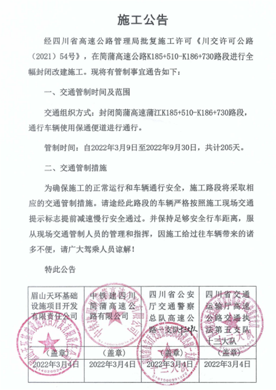 四川新闻网消息(郑佳洁) 今(7)日,本网从眉山天环基础设施项目开发有限责任公司获悉,3月9日起,成都都市圈环线高速公路黑龙滩服务区附近(简蒲段K185+510-K186+730路段)实行交通管制。