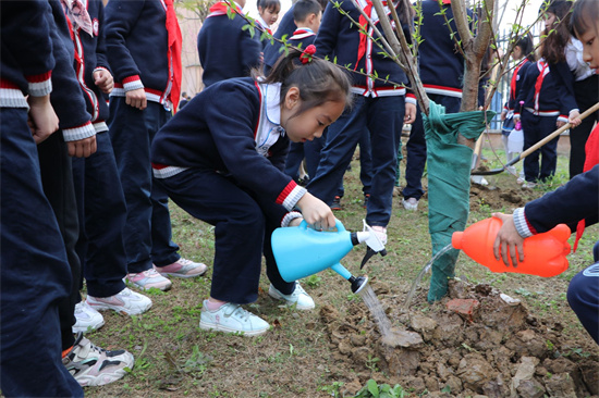 上午9:00,在德育处少先队老师们的组织下,学校领导们率先加入到了植树的活动之中,教师代表们也带领着几十名学生代表紧随其后。老师们和孩子们分工协作,一起种下了一棵棵桃树和李树。