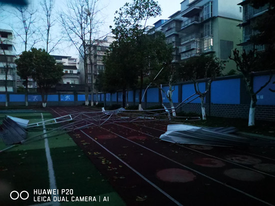 四川新闻网消息 3月16日晚,东坡区思蒙镇遭受强对流天气影响,导致思蒙小学校园里一片狼藉,足球场上、篮球场上停着周边居民家飞来的房屋材料,几棵碗口粗的白杨树、蒲葵被拦腰折断,两棵脸盆大的雪松被连根拔起,校园硬件文化墙遭到严重破坏,校园内满地的树枝、树叶堆成了“小山”,铺成了“地毯”。
