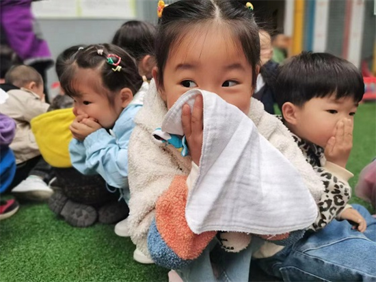 演练中,伴随着火警警报声,小朋友们在老师和安全小组的指引下,迅速用湿毛巾捂住口鼻,弯腰靠墙而走,按照各班指定的撤离路线,井然有序地疏散到达指定安全区域。
